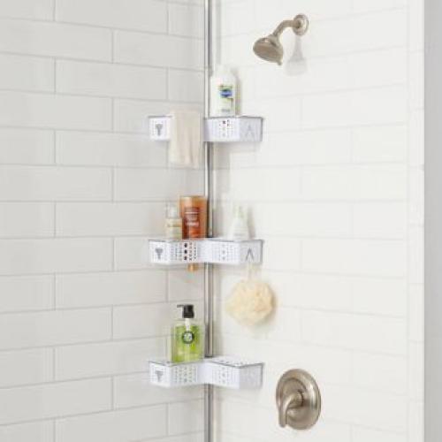 | Resistente al óxido Caddy de poste de tensión de esquina en forma de L Rango de tamaño de 5-9 pies Hecho con marco de metal Acabado cromado Múltiples cestas de plástico. | |